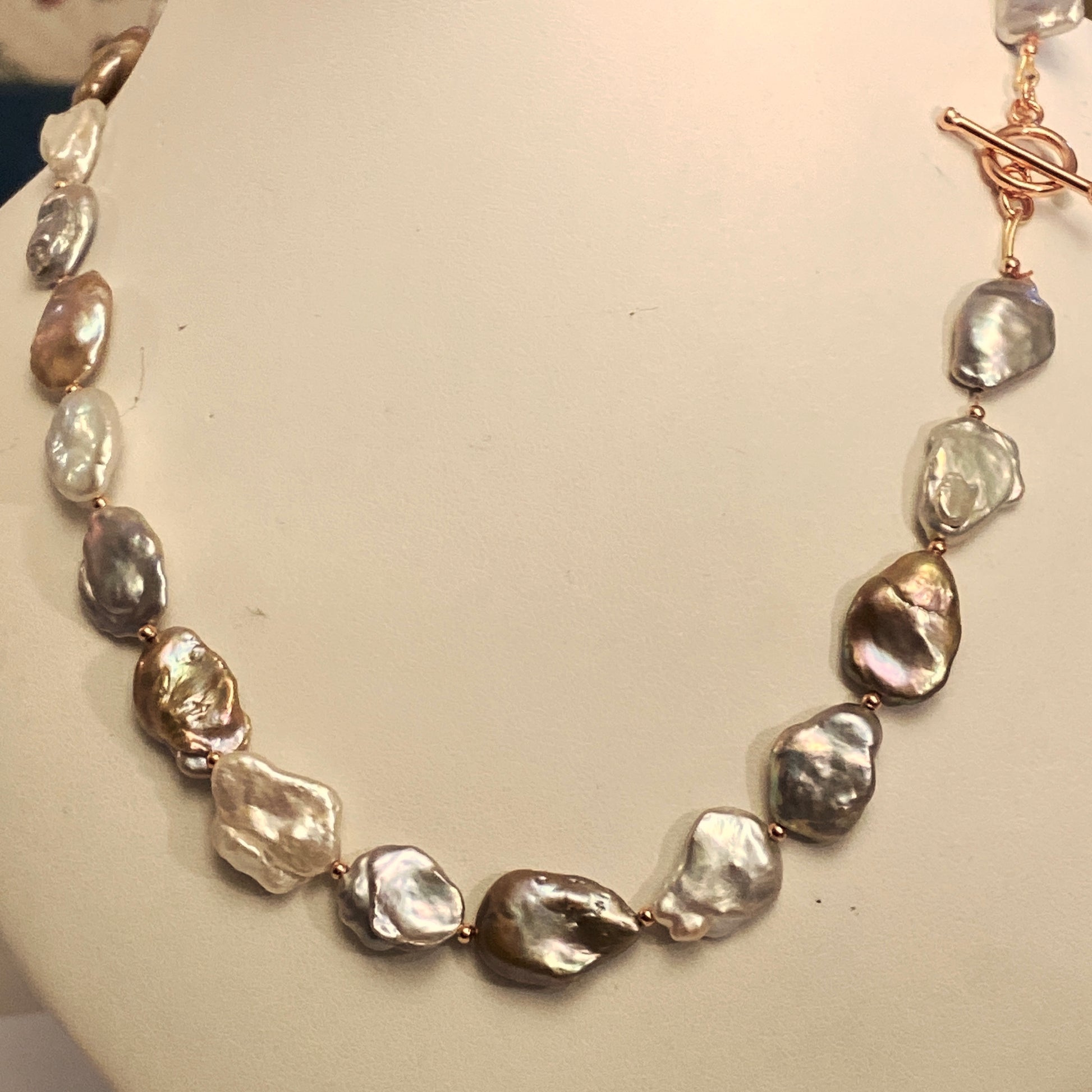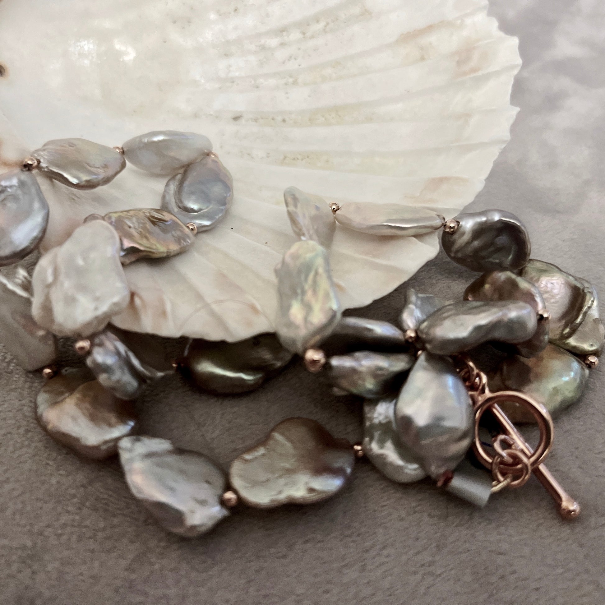 These naturally coloured metallic keshi pearls are interspersed with rose gold plated sterling silver spacers and toggle clasp. The necklace 19” (49cm) in length